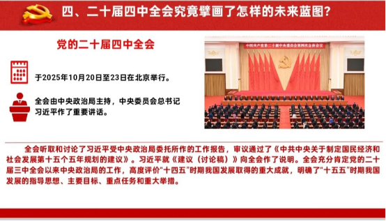 芮老师清晰阐释了四中全会核心定位、规范名称及召开节点与核心议题,帮助我校师生精准把握会议本质属性与重要地位,夯实对全会精神的认识基础,树立正确的认知导向。
