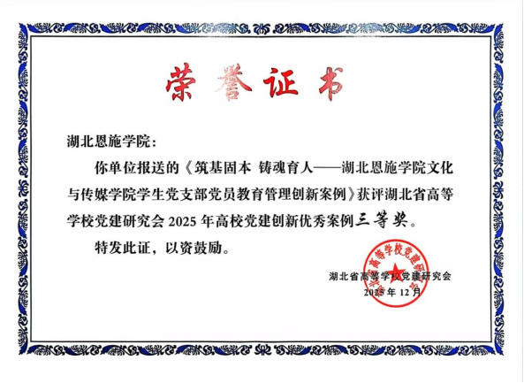 此次获奖是对湖北恩施学院党建工作,尤其是基层党支部建设的积极肯定。学校将持续强化党的全面领导,深入践行新时代党的建设总要求,持续筑牢基层根基,推动党建工作与立德树人工作深度融合,不断探索创新,努力打造更多可复制、可推广的党建品牌,以高质量党建引领学校事业迈向新高度,为教育强国、教育强省建设贡献力量。