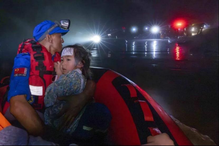 照片以真实场景为底色,既展现了洪涝灾害中救援人员的责任担当,又传递出困境中人与人之间的守望相助,用镜头诠释了人间大爱与生命力量。