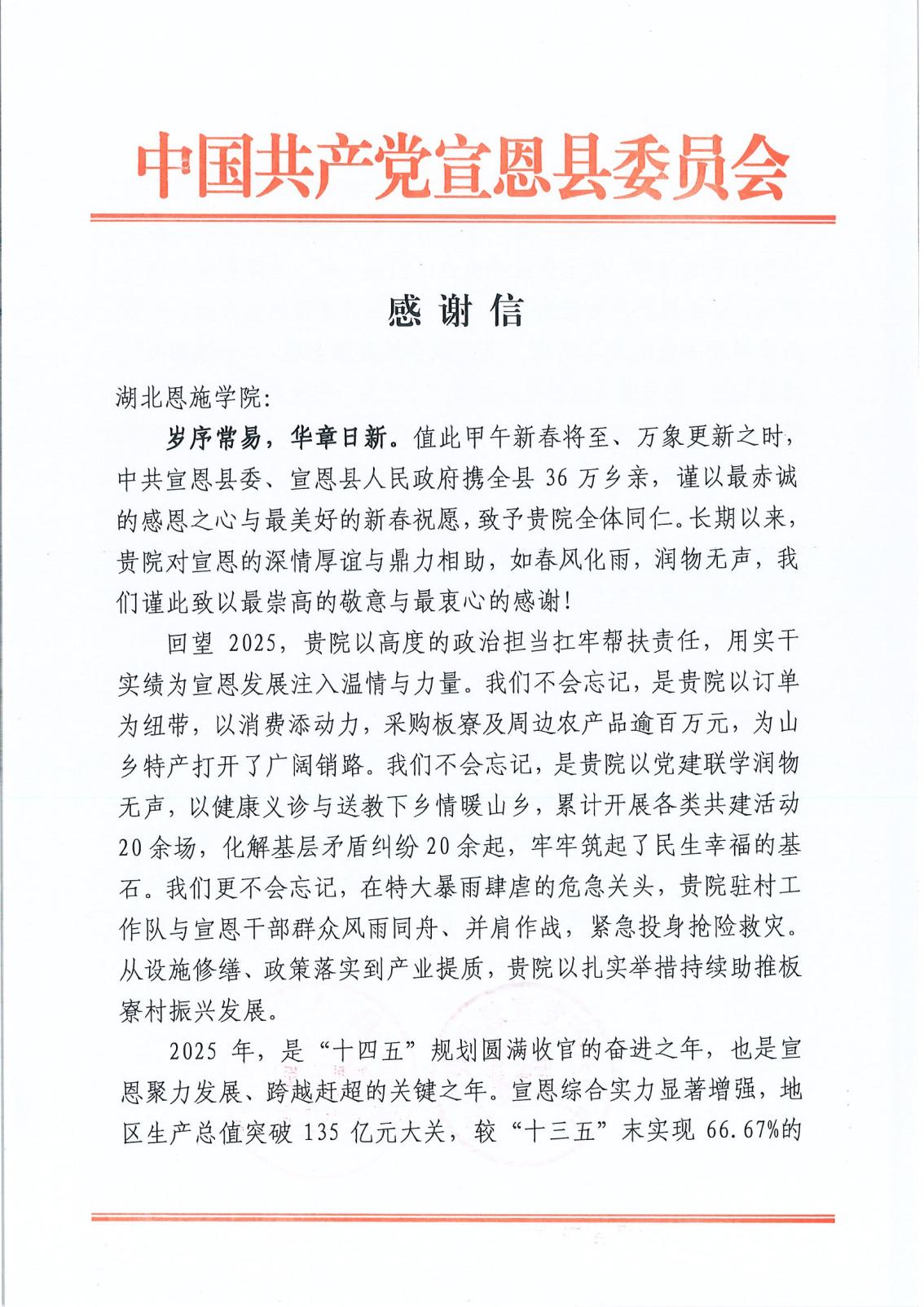 近日,中国共产党宣恩县委员会、宣恩县人民政府向湖北恩施学院发出感谢信,对学院扎根武陵山区,在产业提质、基层治理、民生改善、应急抢险等领域给予的倾力帮扶和智力支撑致以崇高敬意与衷心感谢,期盼在“十五五”新征程中持续深化校地党建联建,共谱乡村全面振兴、区域高质量发展新篇章。