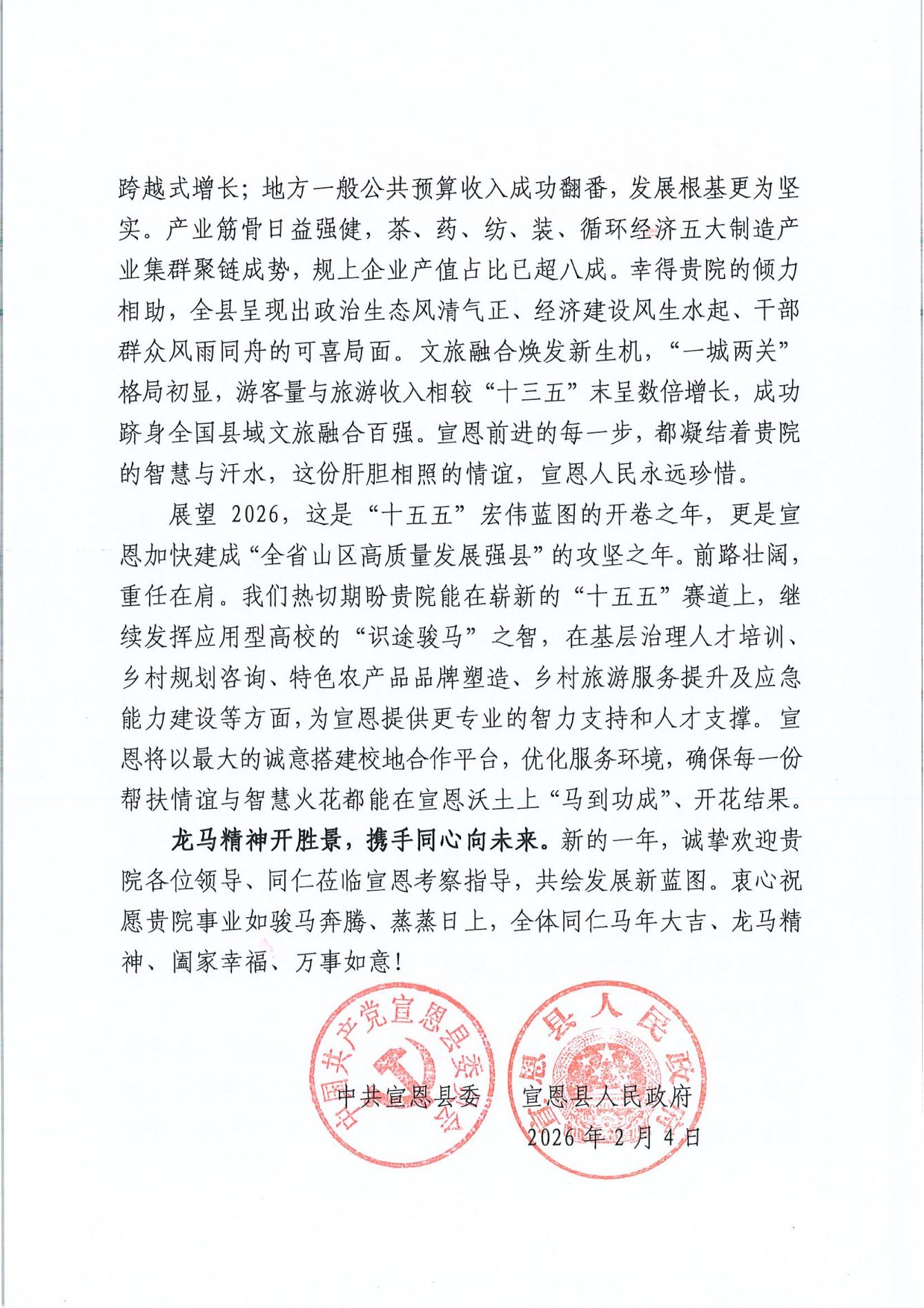 2026年作为“十五五”开局之年,宣恩县正通过强化党建赋能,聚焦科技创新和产业发展,致力于打造省级创新型县,推动经济高质量发展,以实现山区高质量发展的目标。信中热切期盼,学校将继续发挥党组织优势和高校“试验田”“智囊团”作用,在基层治理人才培养、乡村规划咨询、农产品品牌打造等重点领域提供精准支持。宣恩县将秉持最大诚意,搭建党建共建平台、优化服务环境,力促校地合作走深走实、达成共赢。下一步,校地双方将以此次致谢为契机,深化党建联建、凝聚合作磅礴之力,持续擦亮“智志双扶”帮扶品牌,携手共绘乡村振兴与区域高质量发展崭新画卷。
